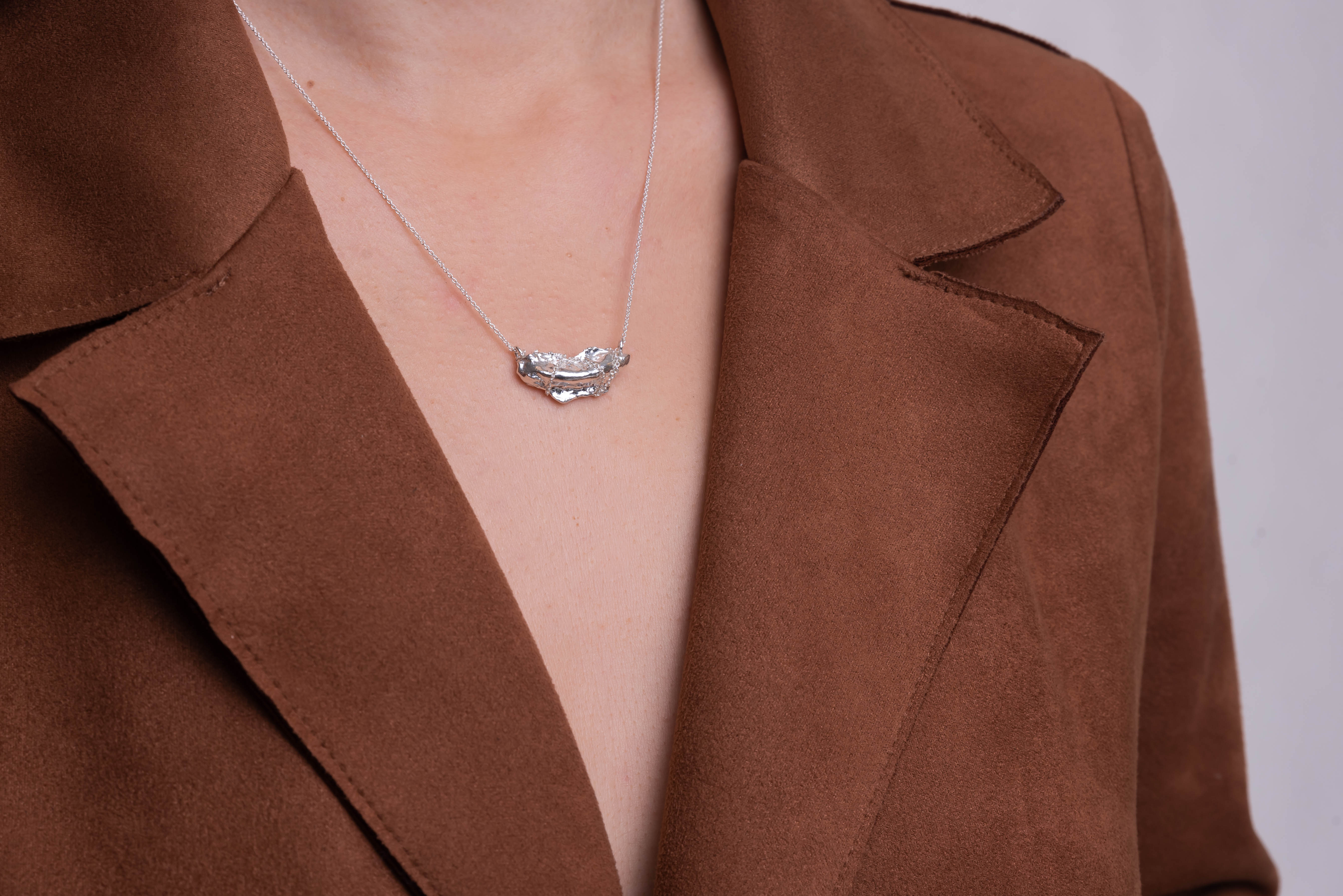Amelia er en unik halskæde, der skiller sig ud med sit eksklusive design og håndlavede vedhæng af vandstøbt finsølv. Vedhænget har en særpræget form med bløde, runde kanter, som giver smykket et harmonisk og organisk udtryk. Kæden er elegant integreret i designet, hvilket skaber en sammenhængende og iøjnefaldende stil.